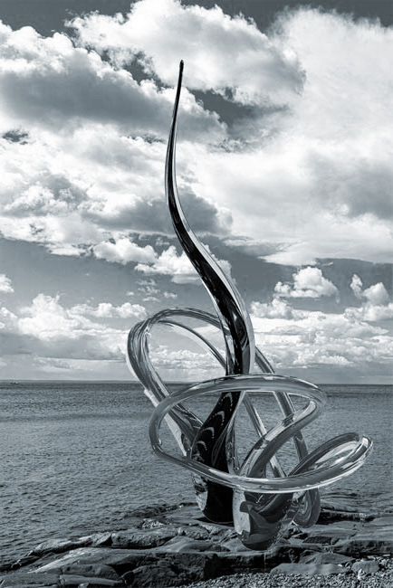Henry, Whenever you photograph someone else's artwork, it is important that you bring to the frame, something of yourself and in this case, you have done just that. Well done. One of the most important ingredients for me in photography is composition and this image ticks that box. I particularly like the way that the black glass rises centrally, the way that the green glass pulls it off-centre and fills the lower left quadrant, and the way that the horizon line is perfectly placed low in the field of view. I agree with Tom's suggestion to convert to monochrome. Suggest you go a little further to colourize the image a pale blue and flip the image horizontally to make good use of the left-to-right lead-in shapes of the rocks. |