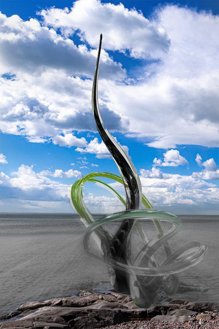 Henry, Alternatively, you might like to leave the colour above and to remove the colour below the horizon line; then add some Radial Zoom Blur centred in the central loop of the glass structure; then Erase the blur from the rocks. This creates the illusion of the finger of glass emerging from the primordial soup and reaching for the riches of the coloured sky, and the monochrome glass changing colour and soaking up the chlorophyl from the environment. Don't you just love photography and digital imaging? |