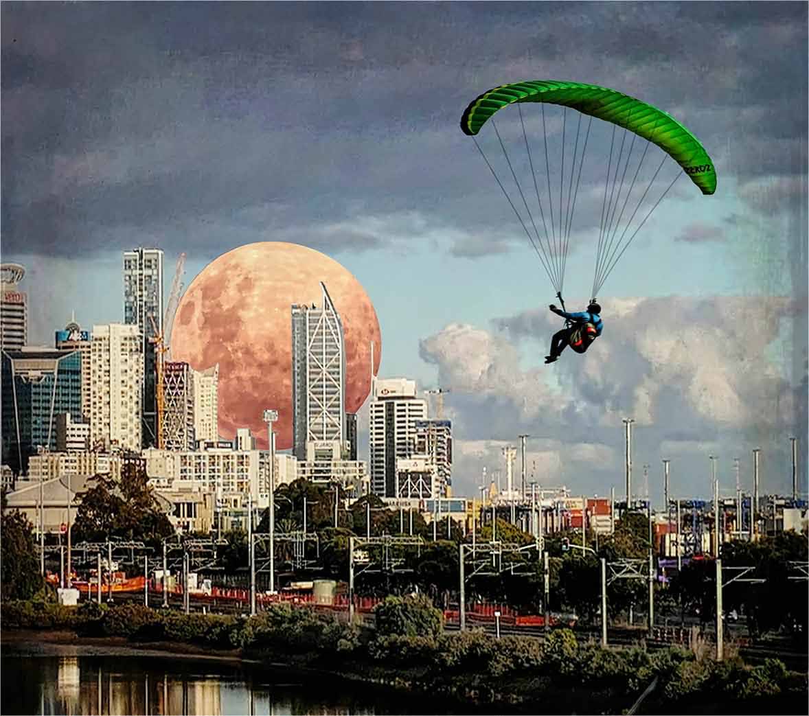 Julie, This was clearly a labour of love in which you have combined the various elements into a composite whole that has a flavour of reality yet it doesn't. The constituent parts are well placed within the frame and all are positioned in their most logical places. Compositionally, the image works well with a myriad of diagonal lead-in lines (the triangular outcrop of rock; the fishermen and their rods; the waterline, the railway line, the overhead gantries; the flight of the glider) all taking our eye towards the moon. Looking at Original 3, you have done well to select the glider from the clouds behind and import him seamlessly into a different sky. As far as titles are concerned, I automatically read 'Parachute Landing - they came, they saw, they conquered'. This is a very busy composite with many individual pictures within it that would stand alone. I find the top two thirds more interesting that the lower third and have copped into this area to show a flavour of what I mean. In this case, the title might be 'Moon Landing' and makes for a much stronger picture. |