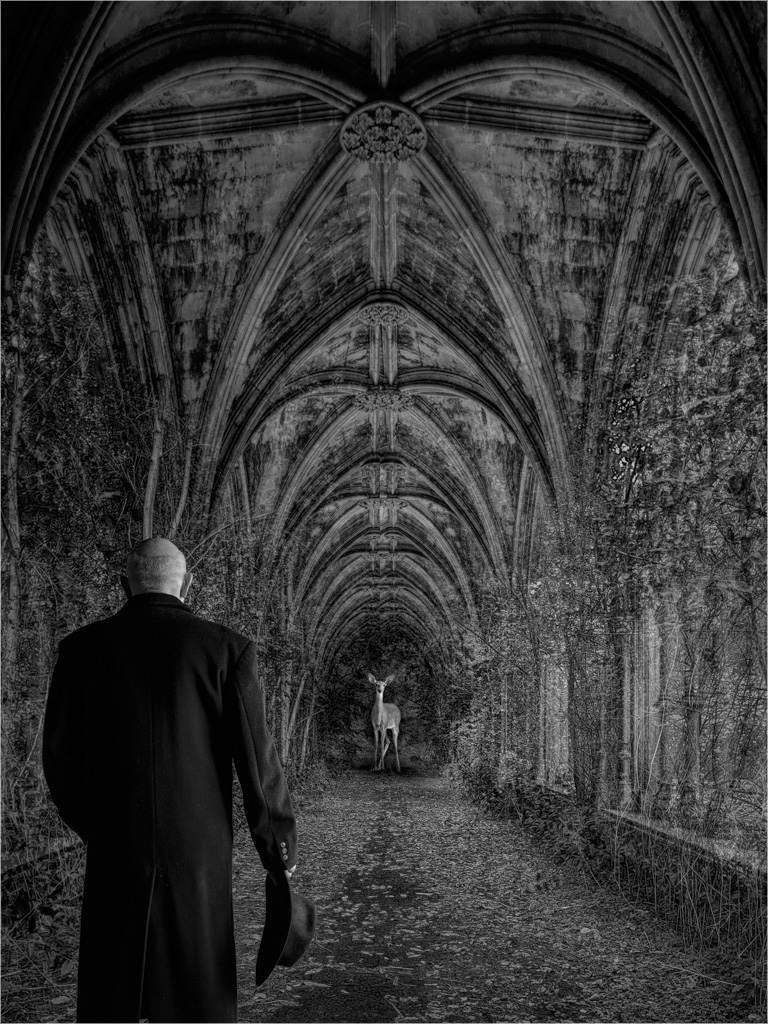 Tom, I warm to all the academic metaphors and interpretation in the 'ChatGPT' description of your image and I can see the spirituality, connection, introspection and contemplation in the image itself. Technically, I like the way that you have reduced to mid-range, the tonality of the combined cloister and woodland which acts as the theatre backdrop against which the figure front-right and the deer mid-distance can perform and are dominant in the frame. Your dark-toned coat helps to isolate your light-toned head and the similarly light-toned deer which emphasizes the bond between you. As you know from my previous critiques, I am a left-to-right visual flow person and for me the image works better when flipped horizontally (see below). In this orientation, at least for me, the lead-in lines and visual aesthetic are stronger. I am more conscious that the figure (ie your good self) poses no threat to the deer and is trying to communicate with it, a fact that is reinforced by the fact that you have removed your hat and you are not carrying a weapon in what is now your right hand. In this version, I have stroked a white line around the image to prevent bleed-over top left/right into what could be a black background. |