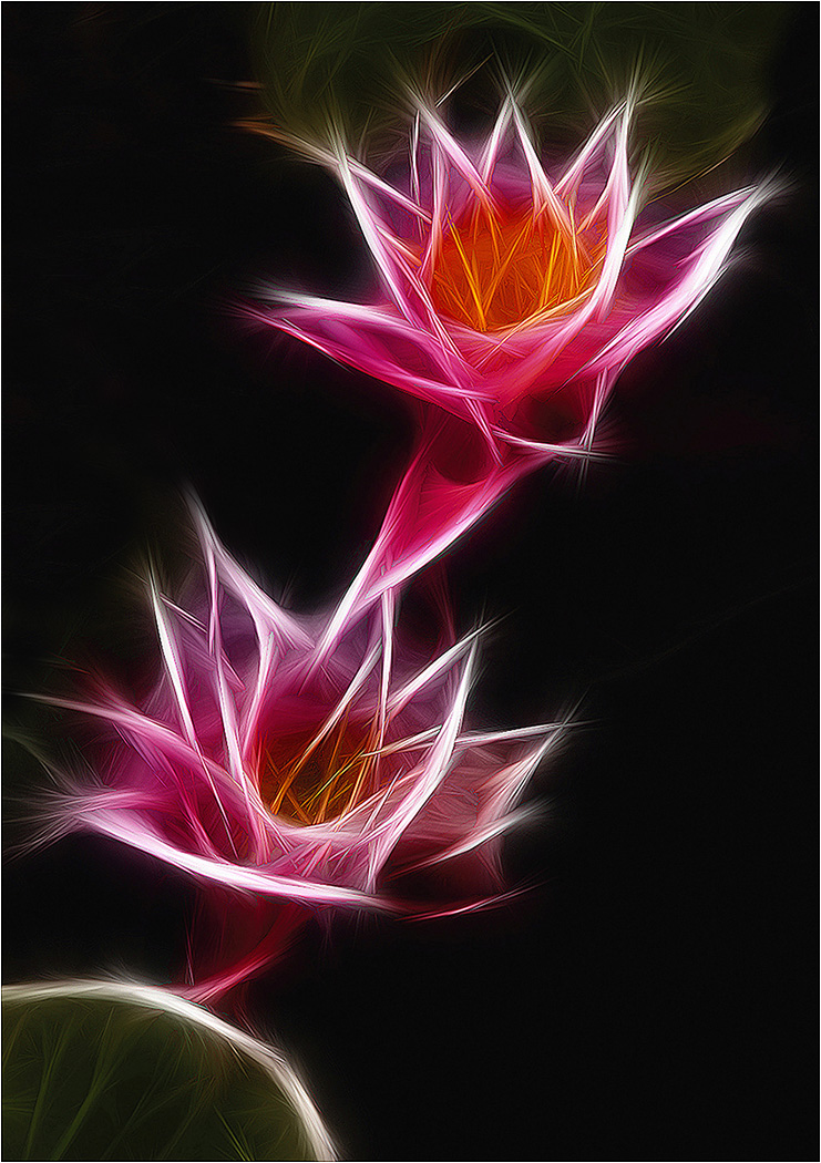 Brad, Thank you for your kind words which are much appreciated. I have always loved the Fractalius filter and cannot understand why anyone could not. However, it is very much a Marmite option; you either love it or hate it. At the time of creating the image, I thought it was important to anchor the two lilies in the pseudo reality of the green base. I also wanted to have three elements in the composition to create the visual triangle of interest. |