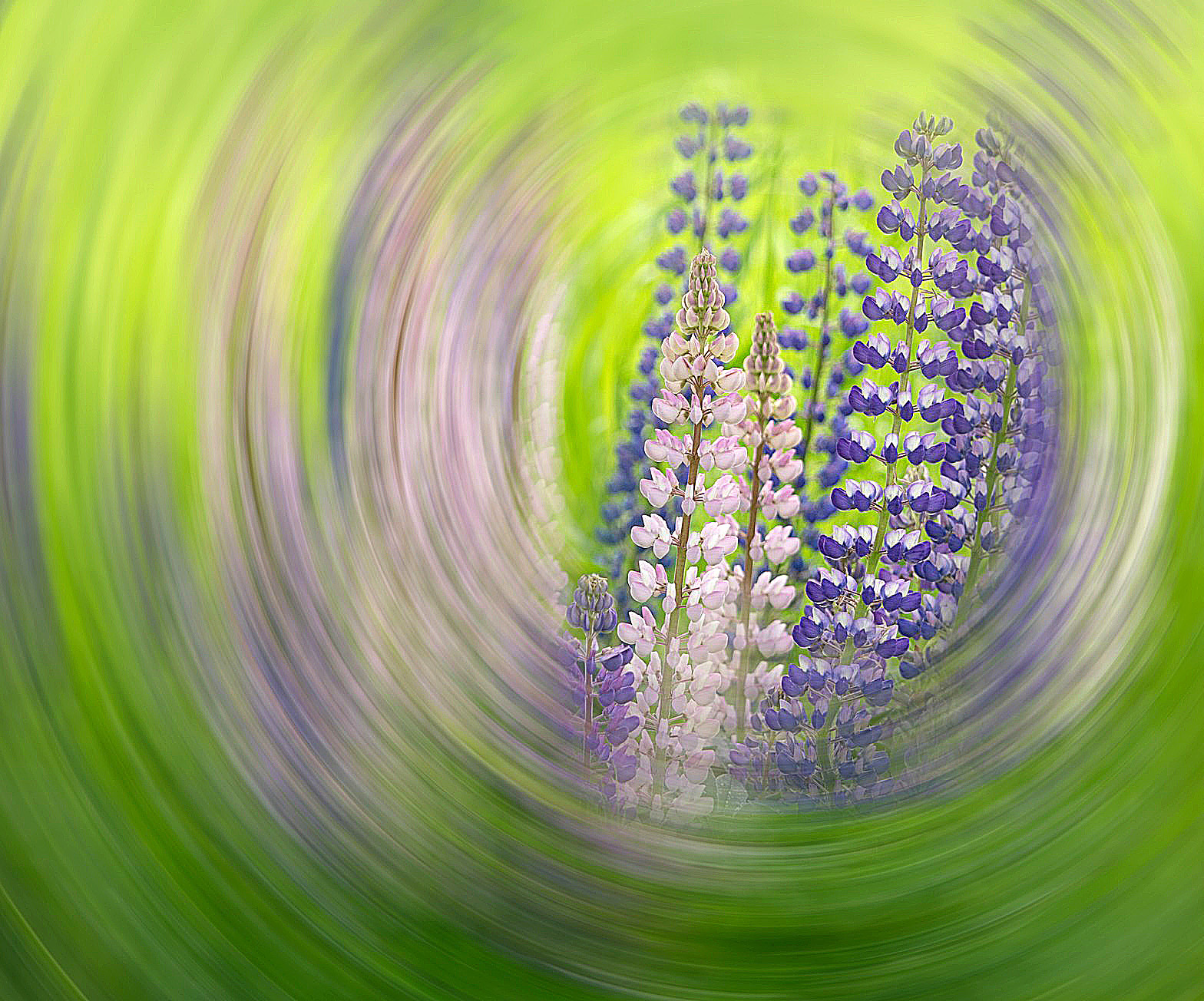 Lisa, I like the limited colour palette and the blend of ICM and slow shutter speed. You have created the impression that we are looking through a swirling tube at the flowers beyond. The lupins have been placed rather centrally in the frame which makes for a visually static image despite the obvious movement created in-camera. In order to improve the overall visual dynamic, on off-centre placement of the main subject usually works. In the attached iteration, I have cropped more tightly onto the lupins, placed them off-centre to the right and added some sharpness to the overall result. This seems to make the lupins stand out even more. |