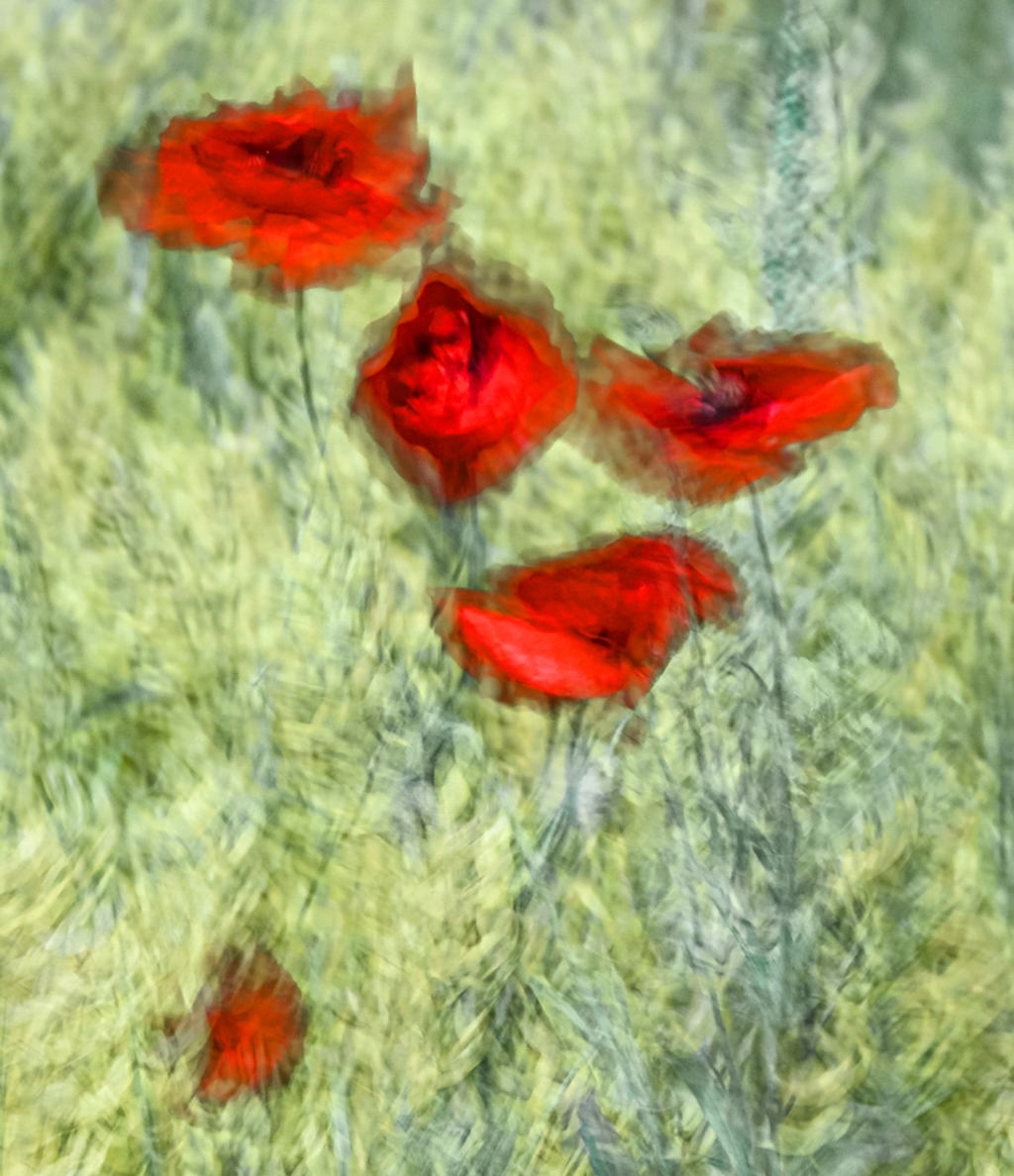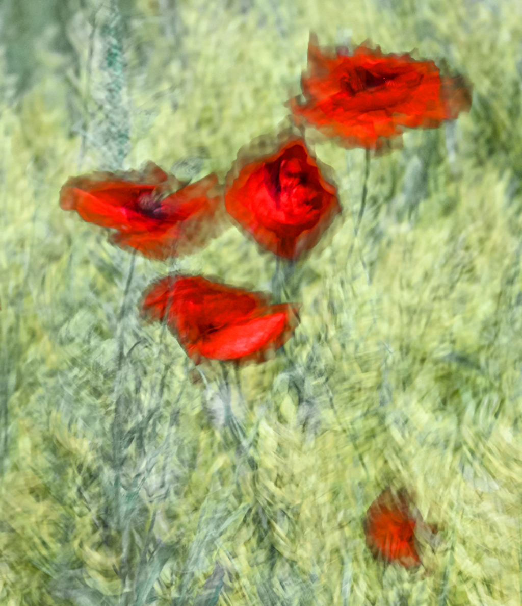Hazel, I have always been a sucker for Artistic Filter effects and Intentional Camera Movement. I don't want to get all the visual messages in one go but much prefer to be drawn in to an image and then to engage with it. Your image ticks those boxes for me. Compositionally, I like the arrangement of the poppies within the frame and particularly the lone poppy that has broken away from the group. It's a personal thing but I am less happy with the soft-focus empty space at the top quarter of the frame which tends to draw the eyes away from the lovely textures in the lower three-quarters of the image. For information, I have attached another version where I have Cropped to almost square and played around with the Hue/Saturation on the green and red channels. In this version, I quite like the contrast coming through in the more subdued steely blues. |