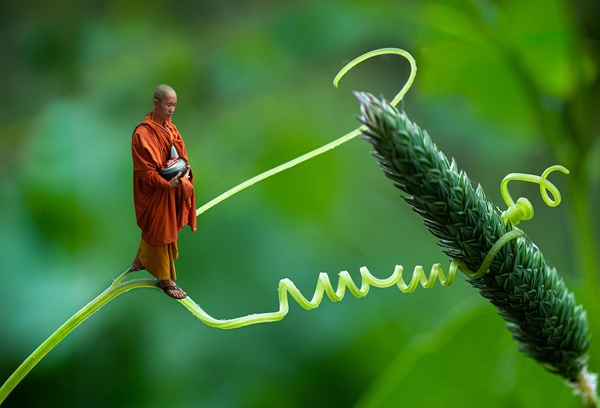 Brad, I like the way that you were thinking outside-the-box to create an image that works well at different levels; the visual message is superb. You have portrayed the Buddhist monk at a crossroads in his journey and illustrated how he has chosen to follow the more difficult route to his objective, which accords well with his religious beliefs. Removal of his name tag and replacement with a more appropriate tassel works well. Photographically, changing the orientation of the monk works well and enhances the left-to-right visual flow through the image. However, I find distracting the leaf edges at the bottom of the frame and the brighter elements in the background. I have attached a tweaked version where I have cropped more tightly onto the subject and cloned out the distractions. This version is much stronger, at least for me. |