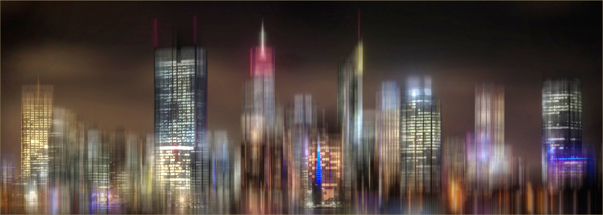 Hazel, I like the way you have taken a standard night-time landscape view of the Perth City waterfront and then pre-visualised it into something else with your use of Motion Blur Filter and Blend Mode Hue. It is a pity that the waterline is central in the frame and splits the image into two equal parts, both of which compete for our attention. I like the effect of the Motion Blur applied to the buildings but I am less so with the effect on the water which seems rather structured and regular. I love the effect on the buildings and for me that is where the image is. I have attached a version where I have cropped off the water to concentrate solely on the buildings and stroked a line around the image. |