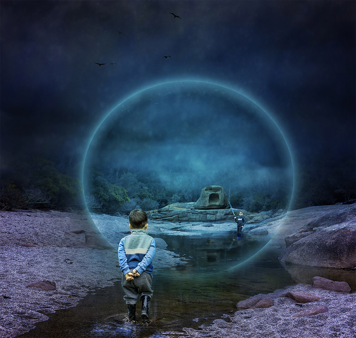 Nadia, Your idea of creating a portal from one universe to another has worked very well and your technical skills have been employed to good effect to achieve your goal. I particularly like the way the ring seems to dissolve into the water and the way that your nearer grandson seems to be actually splashing through the water. I am delighted to see that your signature birds are hovering above the portal ring. How do you feel about the image being flipped horizontally per attached to make better use of the left-to-right visual flow through the image? |