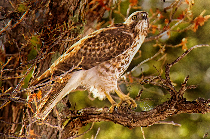 I agree with you that the bird strikes an interesting pose. However, there is far too much detail beside and behind the hawk. Since the bird is the subject, extraneous parts of the image should be cropped out and bright spots top left eliminated. I followed some of those suggestions and submit my changes for your consideration. |
