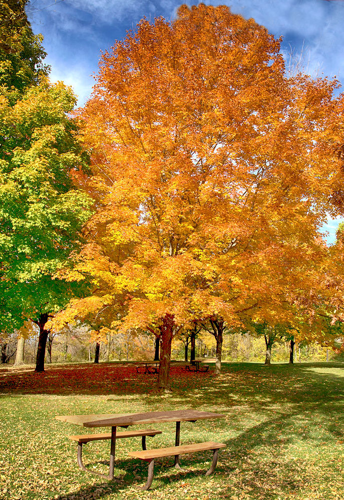 Nice shot of fall. To my taste, however, a little exaggerated color which resulted in a lack of contrast. I tried to boost the blacks a little in my alternate view, darkened the table a little and removed the dead branch at the top of the image - it bothered me. The main tree is a little less yellow - perhaps you might be in agreement with my changes. Otherwise, a great shot - and I won't see this in southern Florida. |
