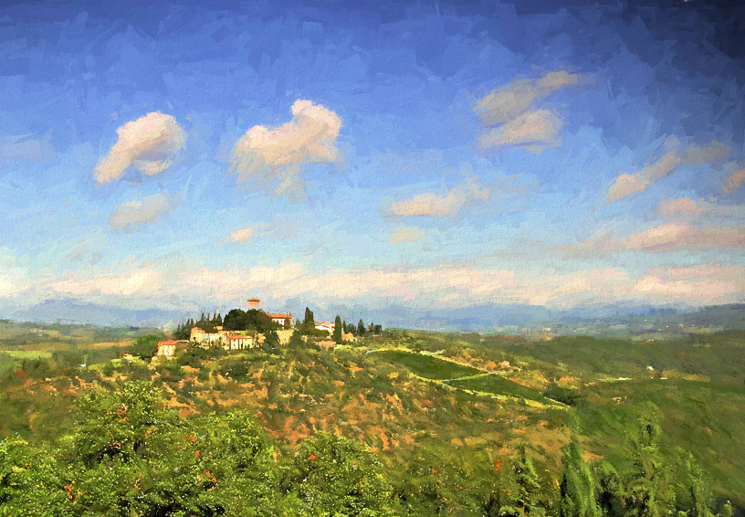 I really like this painterly treatment Pat, especially the effect on the background hills and the sky. "Someday" I hope to get to Tuscany. The wonderful "paths" in the hillside draw me into the buildings and then into the sky. Even though the building in the foreground serves as a leading line into the hillside, I don't think it adds enough compositional interest to the image. My personal preference would be to crop out the large building and then also crop from the left. (See attached crop). I think this crop sets off the buildings nicely and lends a peaceful quality to the image. What do you think? You don't have to agree, but that is why I love this group. We all have different ideas of what could make an image different. |
