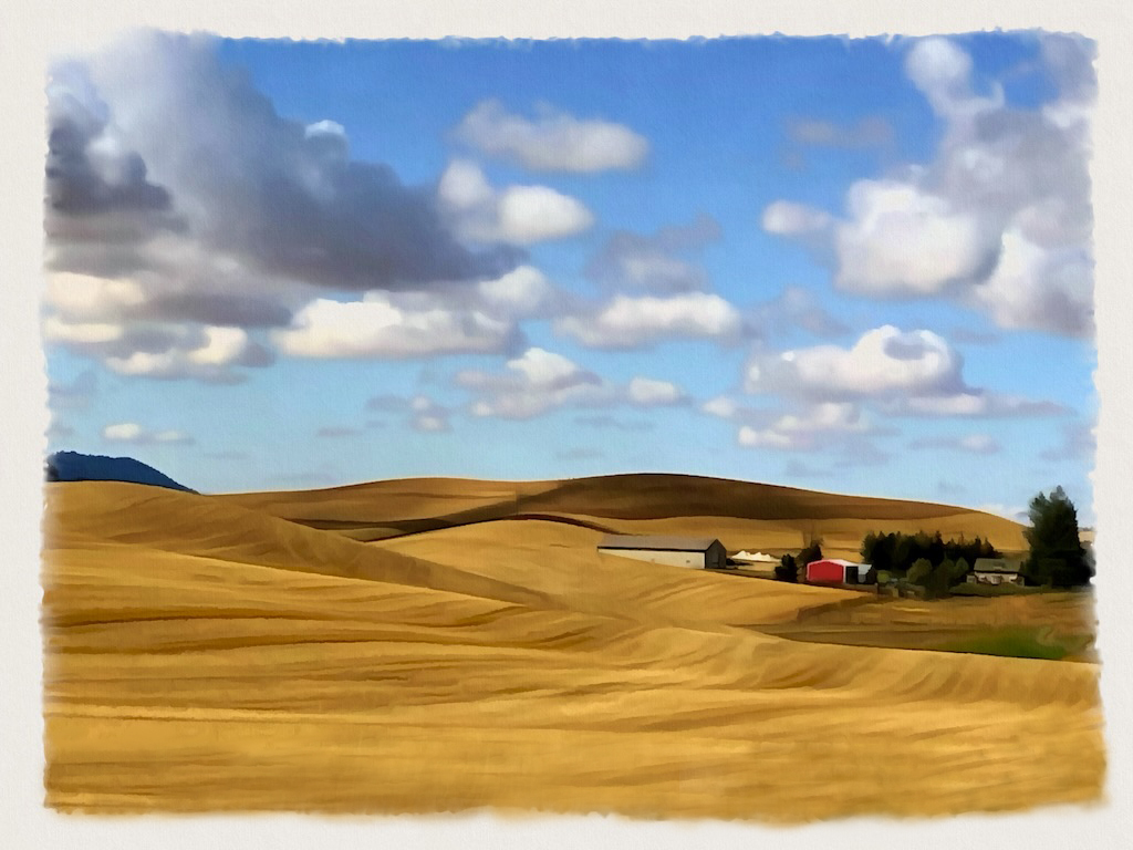 I've been to the Palouse twice; both times in the Spring. I truly envy your trip there during the harvesting season. The gold and brown tonalities are absolutely wonderful. Your processing choices gave this a painterly effect, which is excellent; and the border adds to its appeal. I like the image as shown; but I would also try cropping out (or painting out) the scrub grasses (green and gold) at the bottom of the frame. Then, it would seem that you took the image standing among the fields; rather than at their edges. This would also give the appearance that the fields go on and on. I did create a very rudimentary version, with the scrub, detailed, grasses cloned out. See what you prefer. |
