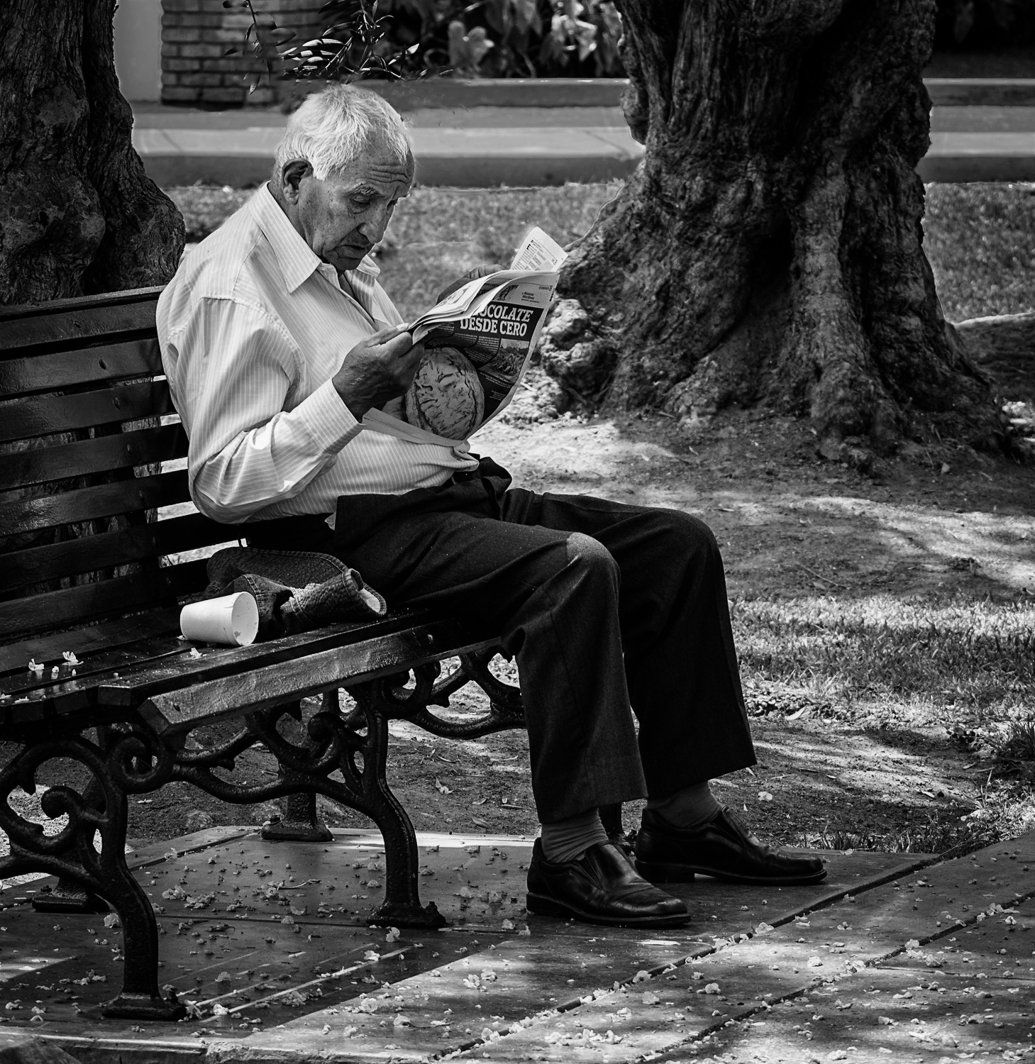 I like the image. Very interesting. I would have tried to get the image with a shallow depth of field. The curb in the background that is going into his head is distracting. This is a very good storytelling image. |
