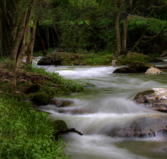 I cropped and put the horizon top third. The stream is the subject. We read from right to left so I flipped the image to have a leading line. These are just some ideas. This is a beautiful image. I used levels in photoshop to give the image more contrast. |
