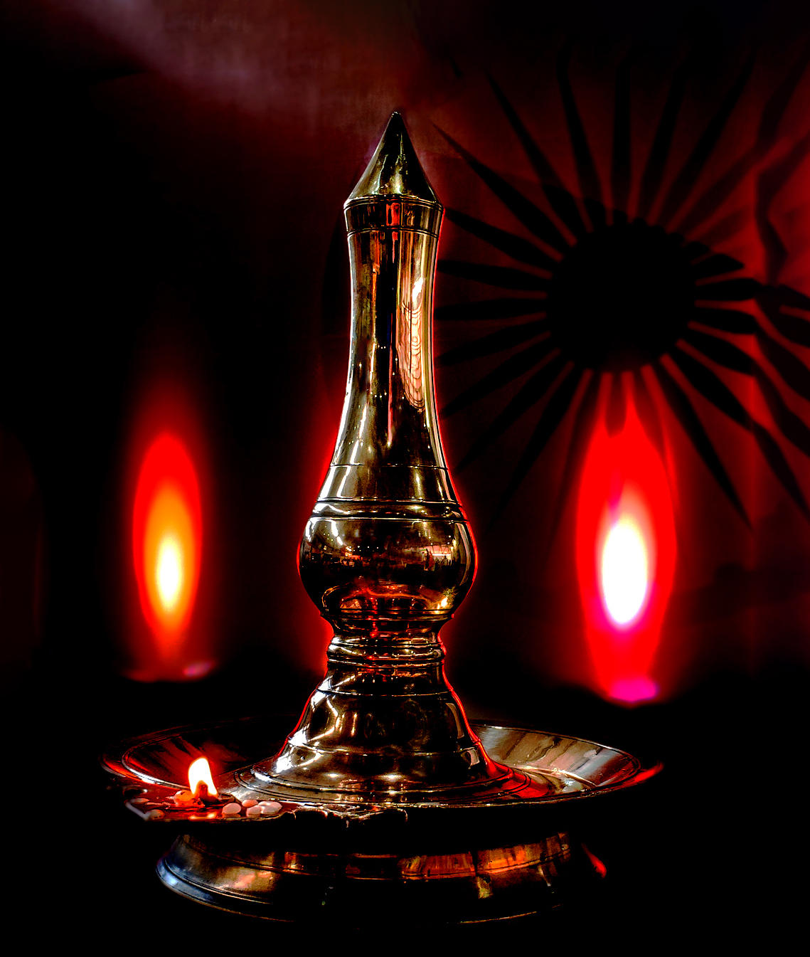 Mike, what an image. I have been scratching my head on this image. I do see a reflection of a man (you) in the Gold Vase. I cloned him out. I feel like the flames in the background is where my eyes want to go. I was think the incense burner could be the main subject. I just worked a little bit with it to see what I would do with this image. |