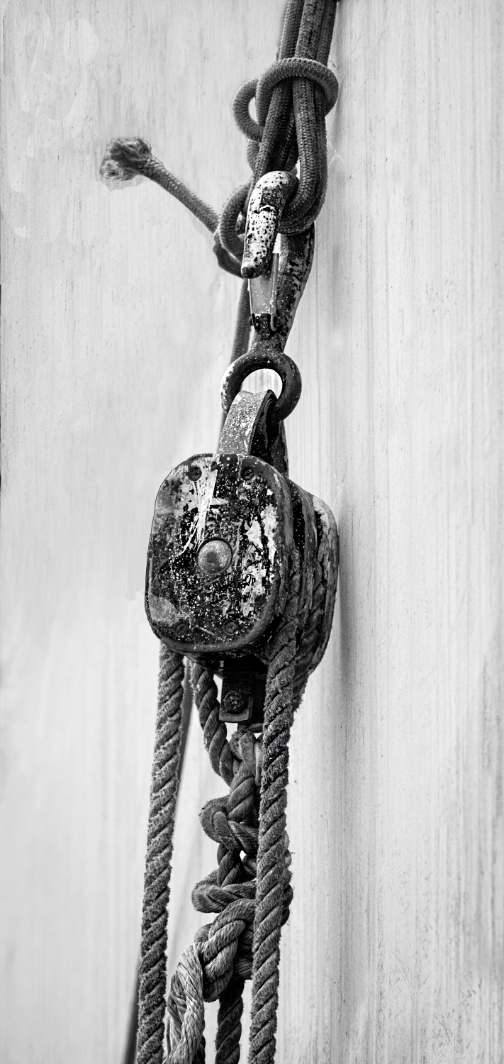 I made the image into black and white. I was trying to make the ropes and wooden piece look three dimensional and not have it blending into the white wall. Lots of work went into this image by you. I really like this image. Love the texture and the lines in the rope. |