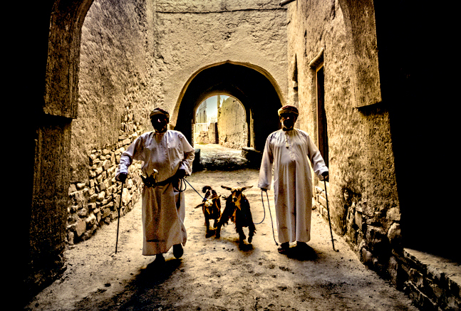 I really love this image. Great street photography, tells a story. I cropped the image and went into photoshop and added a little bit of texture. I like the way the stones on the wall look with more texture. I want to take the blue sky out and just look at the men and the goats. Love the colors and I don't need to see the men's face. Good job on this image. |