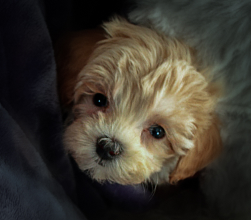What a beautiful Puppy. She looks so sweet. To me the image looks a little soft. I would crop closer to the subject. I put a catch light in the right eye and lightened that side a little. |