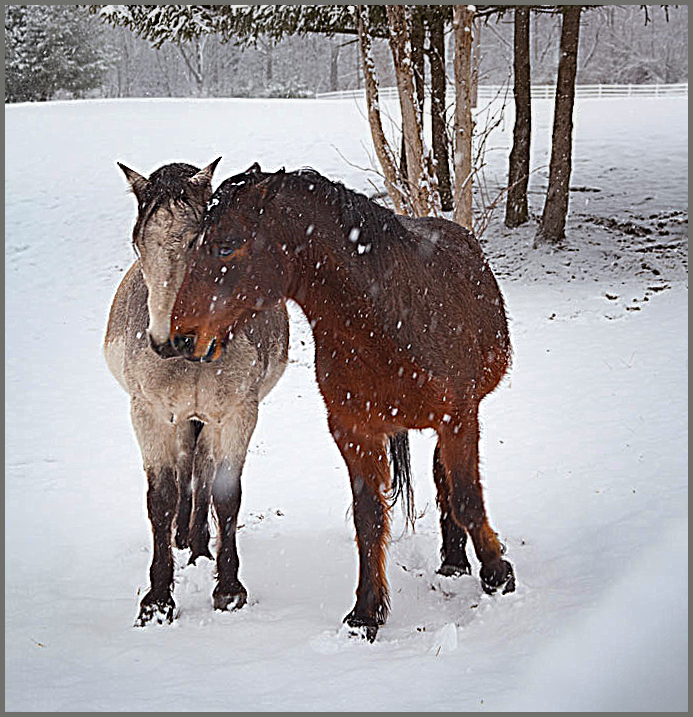 This is such a darling image of the two horses snuggling in the cold weather. I cropped the image and took the original image and worked on it. I sharpen it a little and put the eye of the horse in the rules of thirds. |