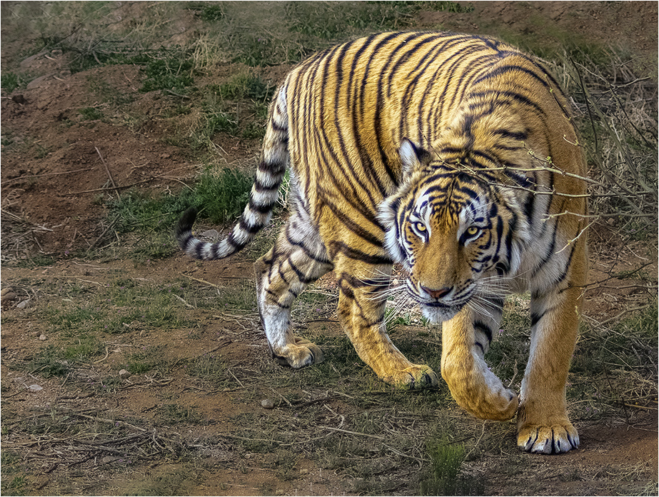 Good Morning Mark. The eyes, he has my attention. I really like the paw is ed up and his tail is also ed. Good use of the rules of thirds. I like the negative space on the left side. I used Photoshop, camera raw, to select the subject and darkened the background just a little. I used content-aware to add some space to the top of the image. Beautiful image Mark. |