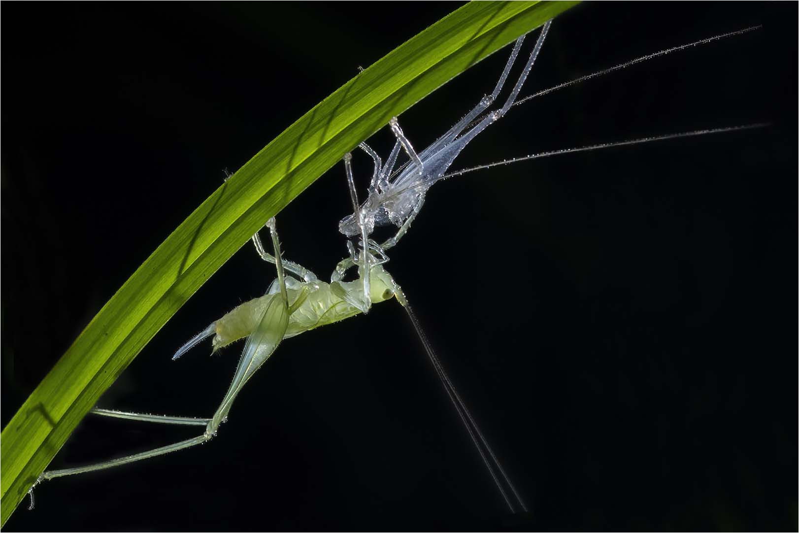I love the contrast and the colors and the action. I have a visual feedback. I duplicated the image in photoshop and went into camera raw and selected the subject and inverted the subject and it did a great job of doing that. I darkened the background. I went in and cloned out what was left from the background. I cloned out some of the antennaes on the subject where they don't go off the page. |