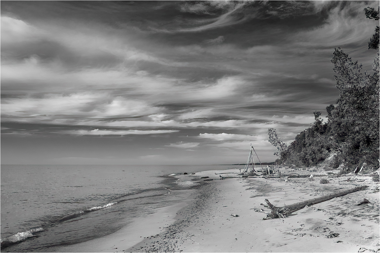 This is a beautiful and soothing image. You mention the clouds and the moody feeling. I darkened the clouds a little. I love the way they are swirling around. Love the tones. They are so beautiful. I darkened the sand on the right to have my eye go to the clouds first. I feel like you have great composition. The leading lines from the wave to the clouds then the sandy beach with the structures. I think this maybe the Golden Spiral composition. What do you think? |