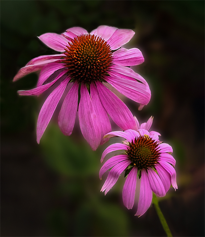 I love taking image of the coneflower. Great contrast flower to background. I agree with Randall, David and Marti. I took Marti's Visual Feedback and added to it. I painted out some of the hi lights on the back side of the top flower. In Photoshop I added more to the image to not have the flower petal cut off on the left side. I used the clone tool to get some the blemish off the flower. |