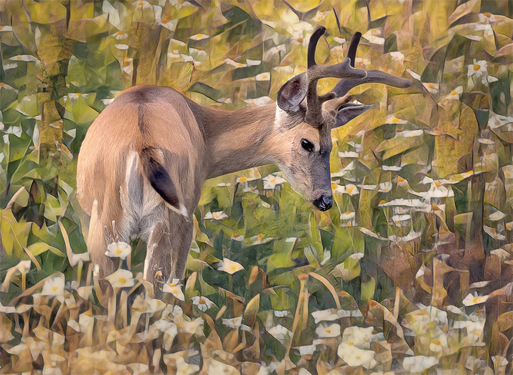 Witta, I think this image looks like a fine art piece to me. I feel like the colors really go together. I went into Camera Raw and darkened the background to have the deer pop more. I can see painting or cloning next to the back legs of the deer and on the left side by the deers belly near his leg there is a light spot that looks different than the rest of the image. |