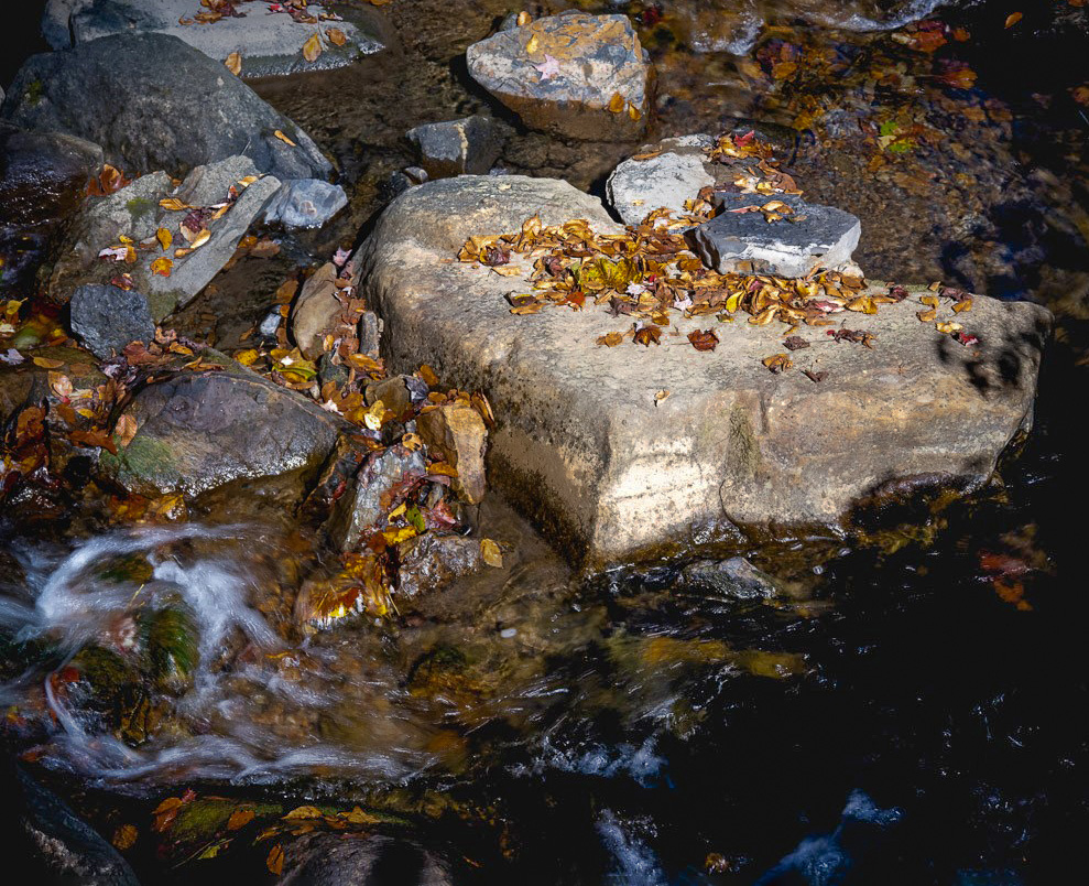 Nice image Lane. Looks like the composition could be the Golden Spiral. It starts at the white water on the left side and goes around the rock and finish seeing all the beautiful colorful leaves on top of the rock. I went into Camera Raw and pulled out the Red, Orange, and Red leaves. I was trying to get the leaves to pop. |