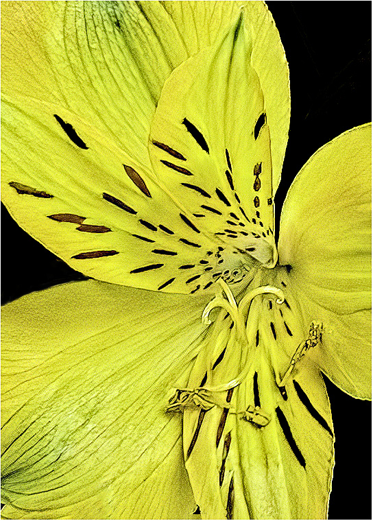 Gerard, I feel like this is an exquisite image. I have a visual feed back. I would make the background black. I feel like the lighting is great. I used Photoshop and Camera Raw to select the background and painted the black background. I did a Black and white balance. I took down the hi lights a little. I wanted the detail in the flower to pop. |