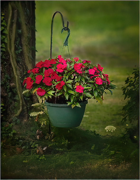 Connie, I know exactly what you are talking about when you are talking about things have changed for you with your computer. I have been going through the same thing. Like you are walking with two left feet. LOL. I love the contrast in this image. Love the tree on the left side with the large vines growing up the tree. Good contrasting colors. I darken the white flowers, my eye goes to the white things first instead of the beautiful red flowers in the pot. I feel like the flowers is the subject. I cloned out the white large spot in the background. This is just suggestions what I would do if it was my image. |