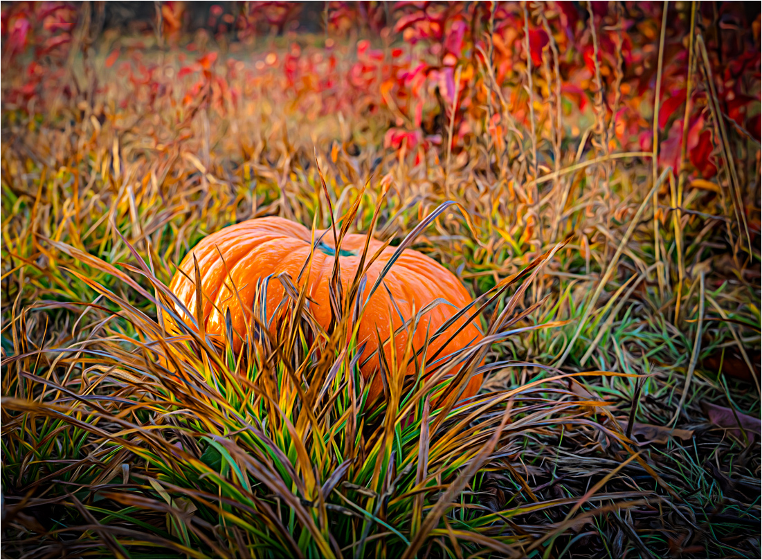 Denise, I love the saturation and the colors. They all blend. I cropped out the horizon. I cropped some of the red/orange leaves on the right to the left side to be a little more balance. I used a black brush on some of the bright golden straw. I want all my attention to be on the beautiful pumpkin. Really like the finish you used. |