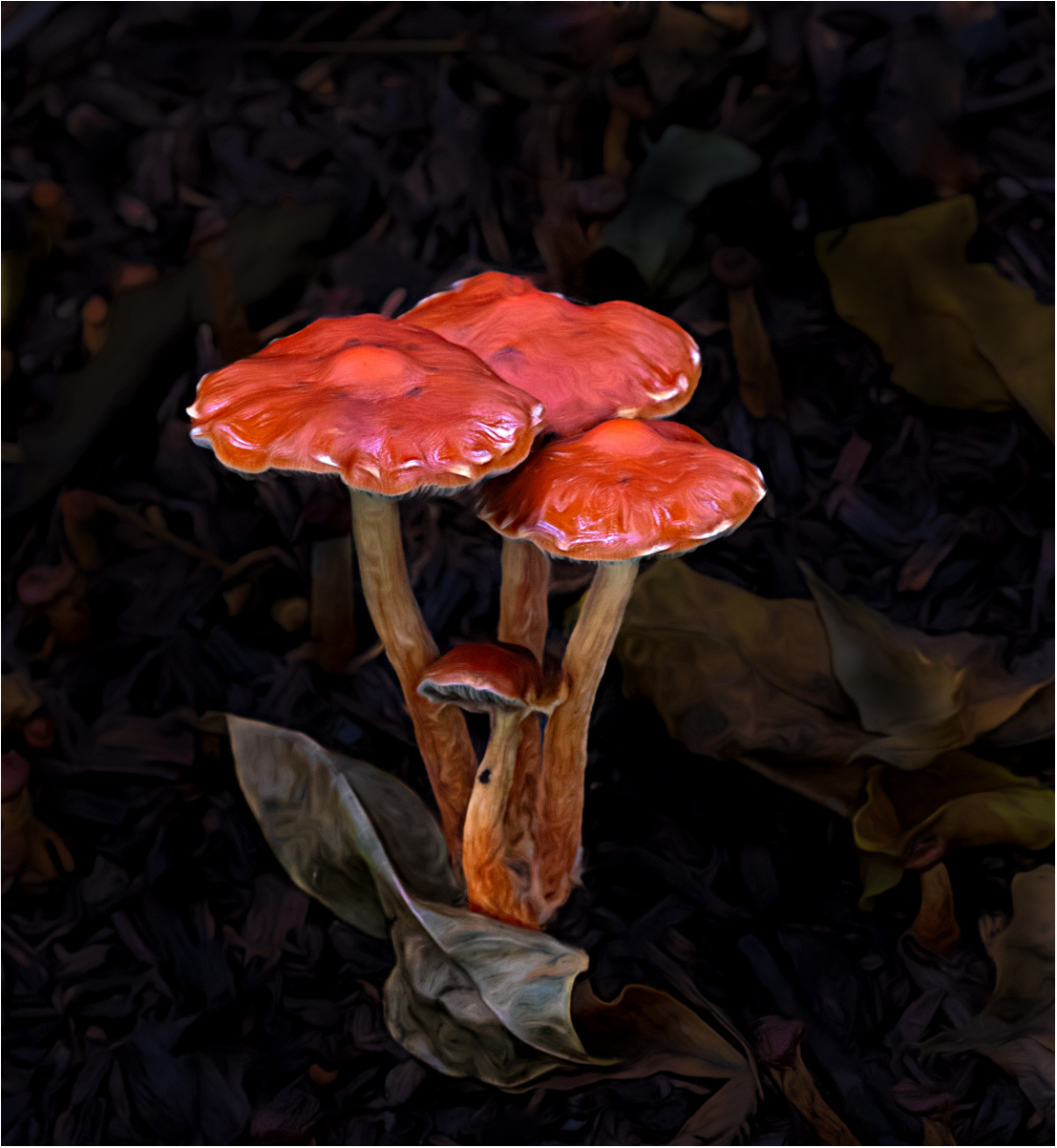 Denise, All I have to say is WOW. You out did yourself. I love taking images of mushrooms. In South Louisiana the mushrooms are not colorful. I do have a Visual Feedback. Not too much, just bring down the light items in the image. |