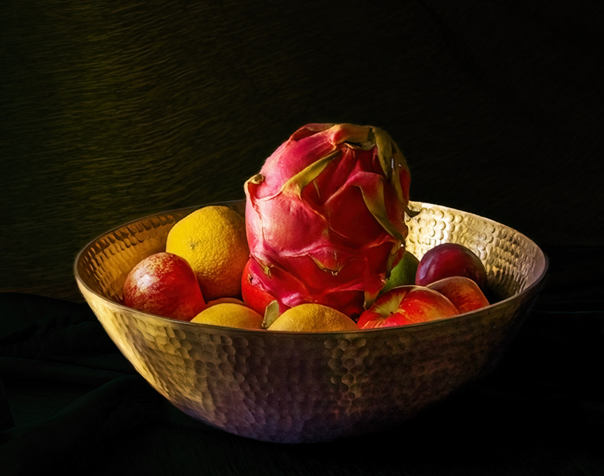 Georgianne, I think you have a great idea. The window light and the drapes in the background. There is a lots of lines in the drapes that are a little distracting. The fruit look a little flat. The back of the bowl is in the shadow. I hope you are ok with me working with the original image. I cropped it and took out the line in the background. I use photoshop and camera raw. |