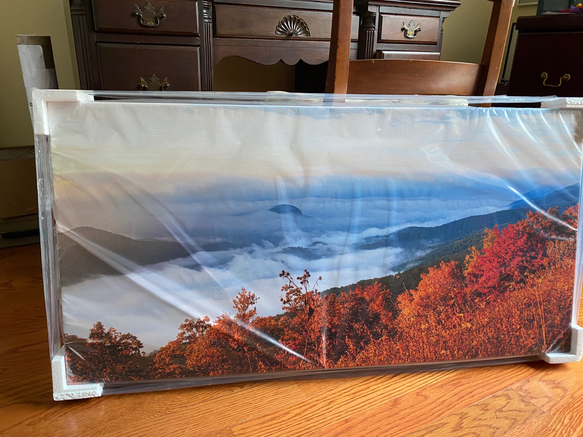 This is a phone image of the finished image. It is wrapped in plastic and getting a reflection. There is a lot of pastel in the sky and is not blown out .Phew!