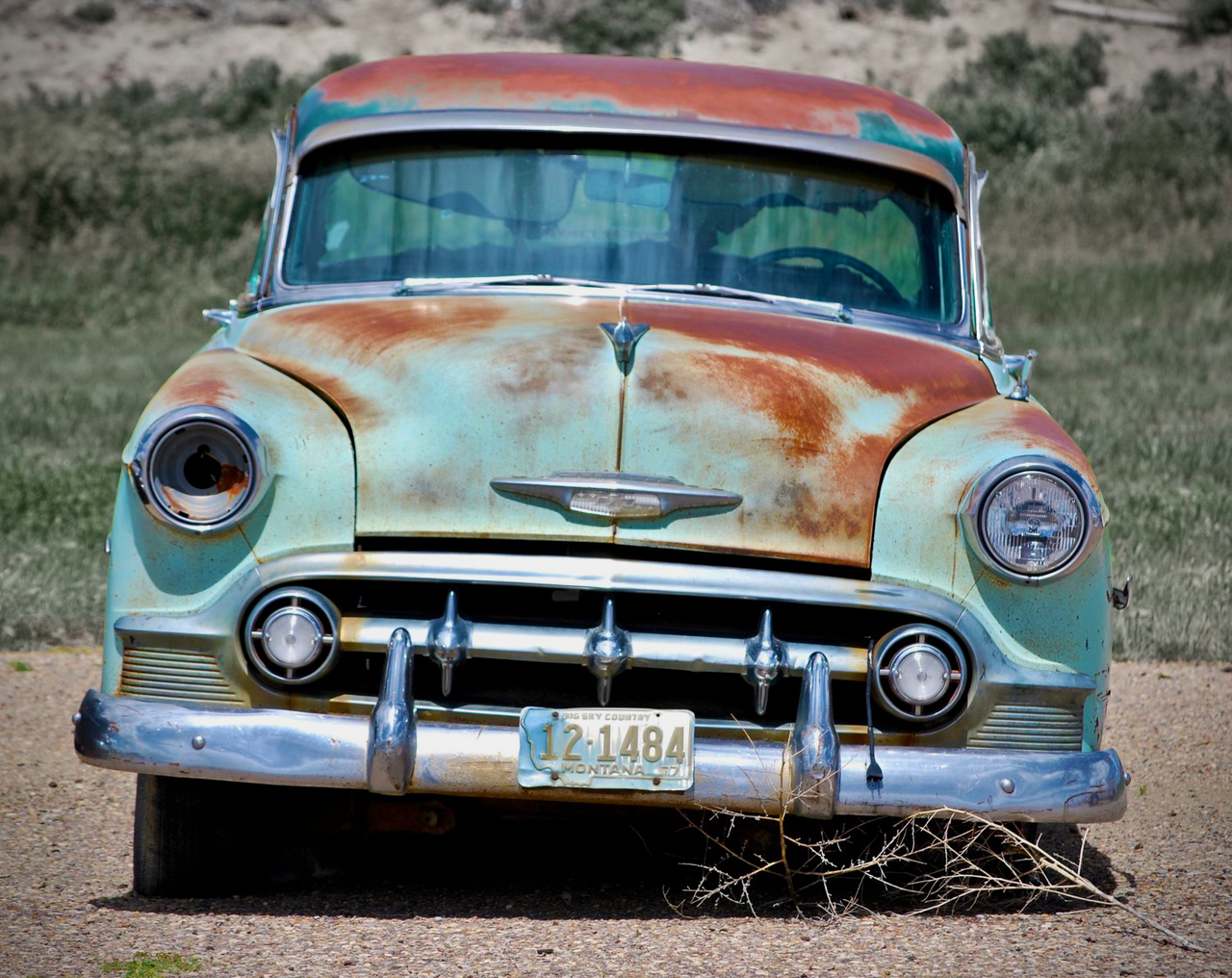 This ol' car is quite a character, with much to say to passersby and lots to offer a photographer. I tried to add a bit to its post-automotive vitality with a little color saturation and slight exposure reduction on the car, while slightly desaturating the green grass in the background. |