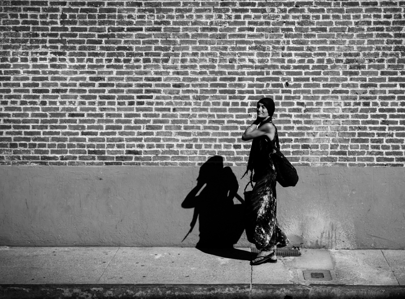 I would agree to crop out the stop sign and just have the brick building, I cropped a little of the left side and adjusted the person to be in the right third of the frame. Less distracting this way. |