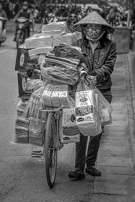 This is a very interesting image. I do like all the details, the only thing that distracts me is the white motorcycle in the background, my eye keeps going to it. So I cropped it out. I also did the conversion using a green filter which brought just a little more shades to the fabric she is carrying. I like both the color and the monochrome image, each shows something a little different. Nice shot. |