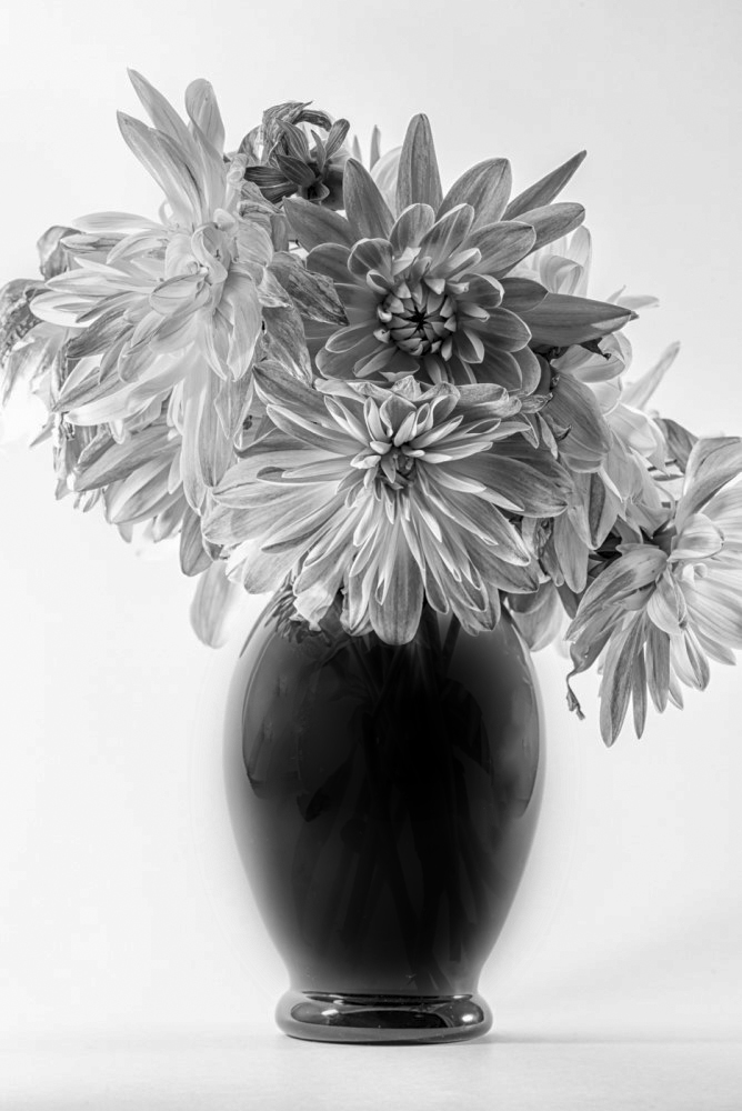 I like your basic concept, but it does need more room on both sides of the flowers, I don't like how some of the blossums are cut off. The other part that is distracting are the stems inside the vase. I made a selection of the vase and copied just that and set the layer to multiply and the did it again. This darkened the vase up quite a bit. I then took out the reflection on the vase as well. |