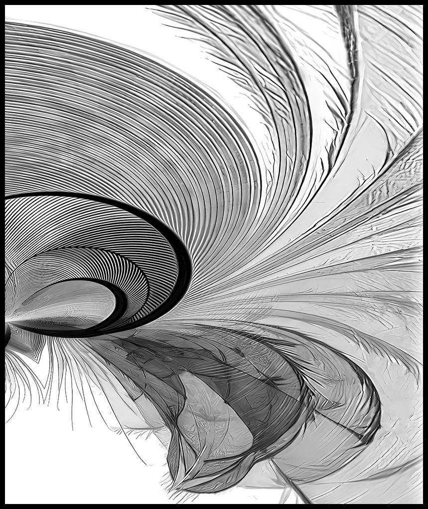 A gorgeous graphic image which works extremely well. My only thought is that by keeping the original feather dimensions the shape if the new image is perhaps a little too long. I have taken the liberty of changing the size slightly and added a small black frame which I think emphasises the creation. |