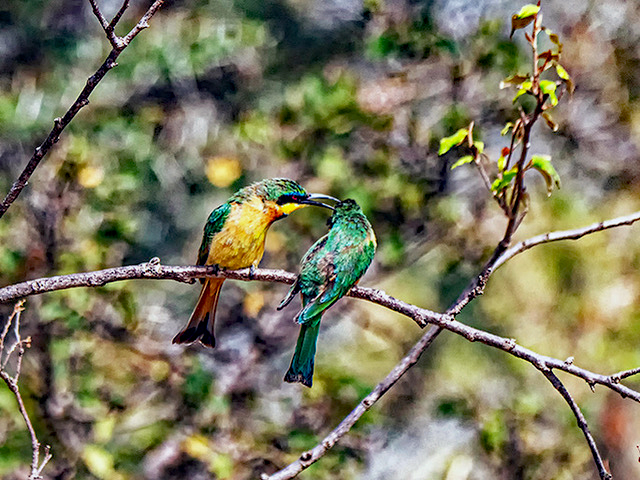 A beautiful coloured image of the two bee-eaters caught at a great moment. I find it a pity that the background is so busy that it competes slightly with the definition of the birds. I have applied colour correction and haze removal to your image, and I think maybe it helps to isolate the birds and the branch from the competition. |