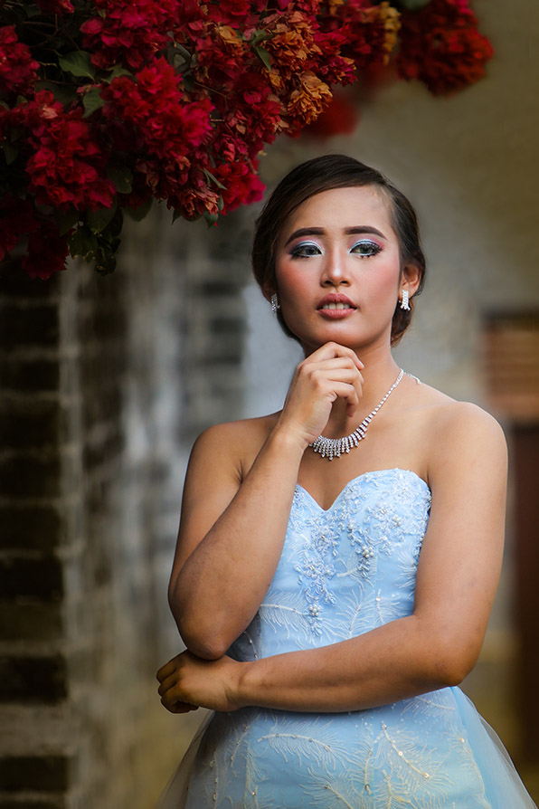 I think she looks "thoughtful" and the position of the arms reinforces that. The depth of field is good and you could blur the background a little more. Good use of the available light. The flowers top left are great. I would suggest cropping a little more off the bottom. |