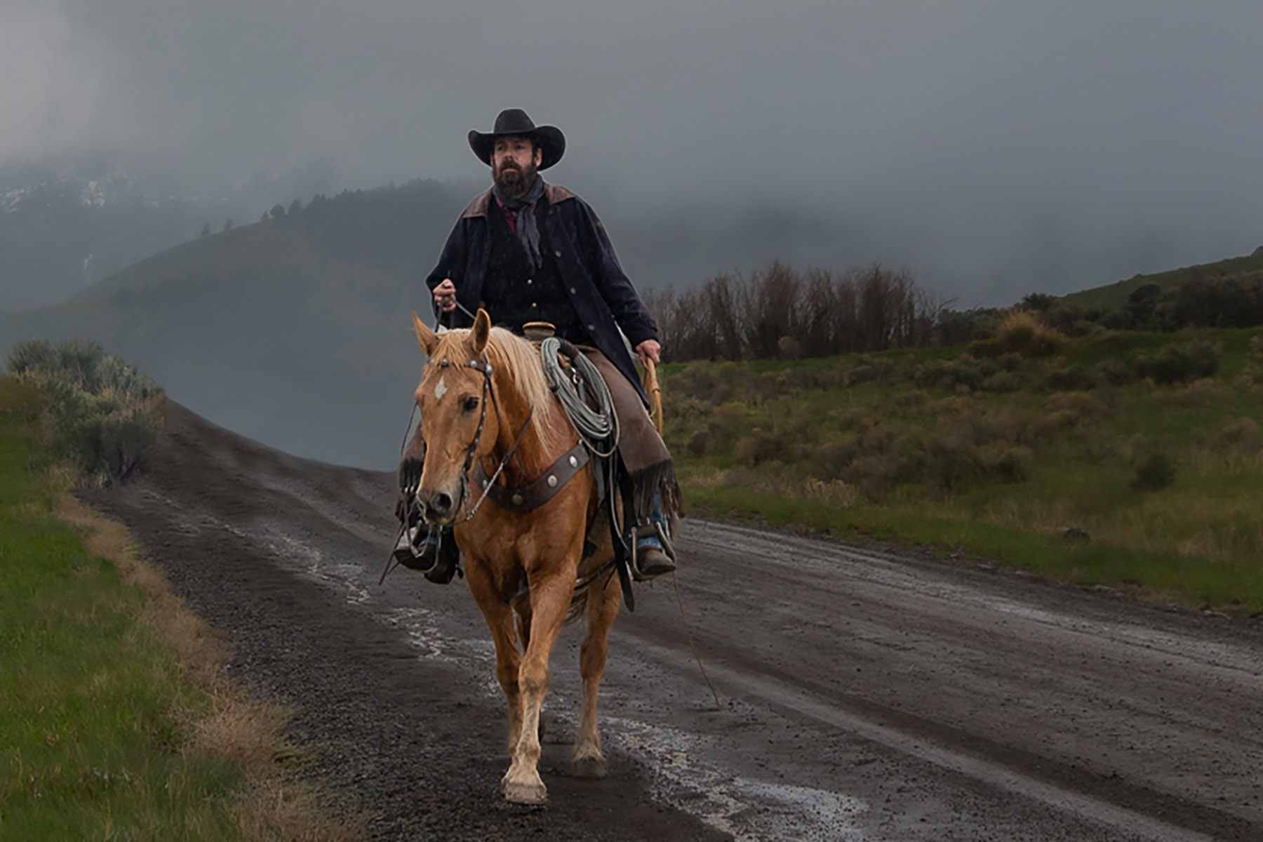 YES! Wonderful story telling. I think the rain adds so much to this image. The soft light complements your image. I think he actually has his left hand on his rope. You were at the right place at the right time. I wonder about the crop. The fog/rain and mountain tops - middle and going right are very important. |