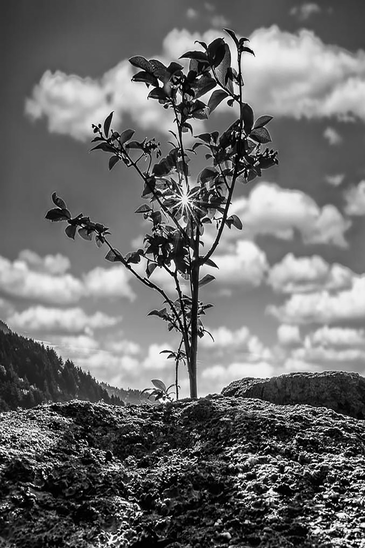 An excellent B&W. All the tones! The starburst adds so much. I don't think the bottom third of the image adds anything. The tree, sky and skyline are what is important. |