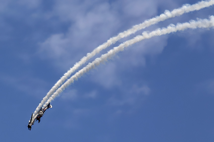 Harley. I have waited to comment. I have been thinking about your image. Sometimes, less is more. I like the sky and smoke trails in the original image. I think the edited image is over sharpened. That gives the smoke and the planes a somewhat unusual look to my eye. This is a really good image. You can apply these topaz affects to the image and then remove or cut back on the effect with the history brush. You can really detect the corruption in the smoke trails. Those trails don't need to be sharp so just remove the effect there with the history brush! I think there is merit in the crop suggestion from Bunny. Having the planess appear to be coming out of the dive is sort of more comforting. Yet, your original may be more exciting. Just sharpen the planes and see what happens. |