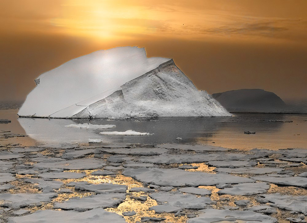 This is stunning. The sky adds magic to this image. You have nice reflection and the golden light in the bottom third of the image complements the sky. The shape of the iceburg brings to my mind a "slice". I am ok with the dark gray of the background iceberg. I agree with Bruce and I think the subject iceberg would benefit from a little less grey. |