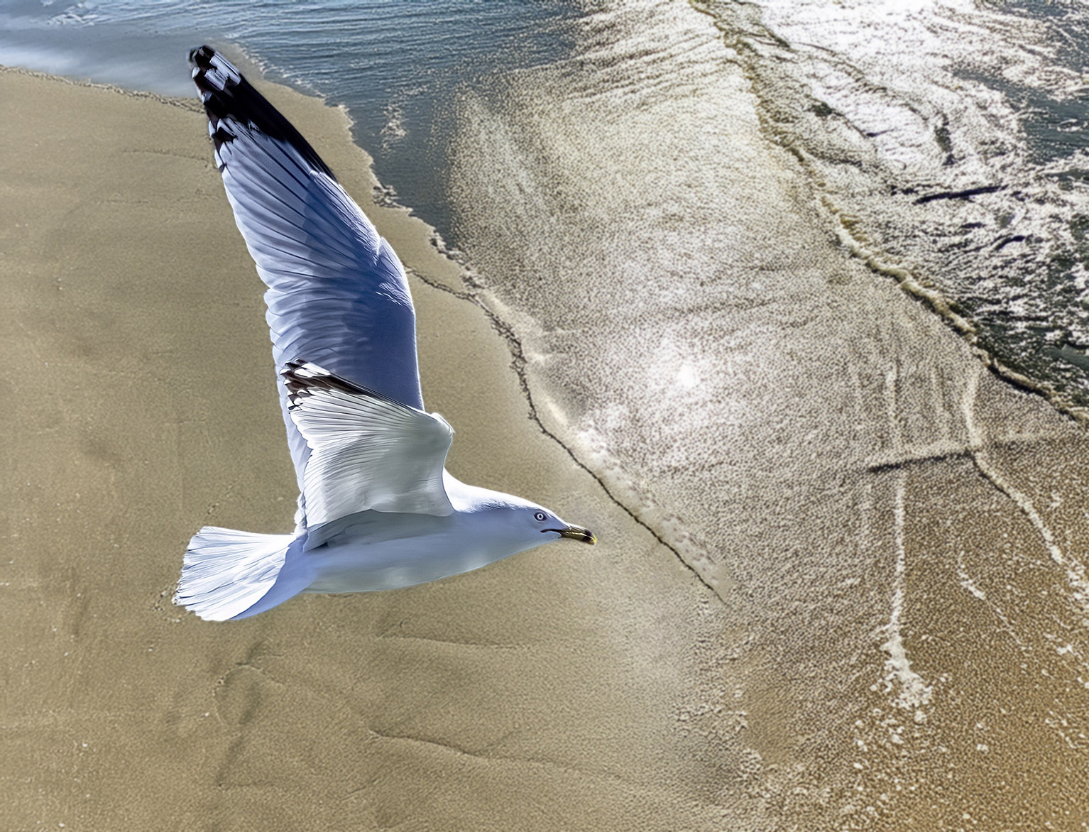 What an exciting image. At first I thought it was taken with a drone. The background for the image really really makes me think "flight". There is dark sand in front of the bird's beak and I would get rid of that. Good shot of the gull. |