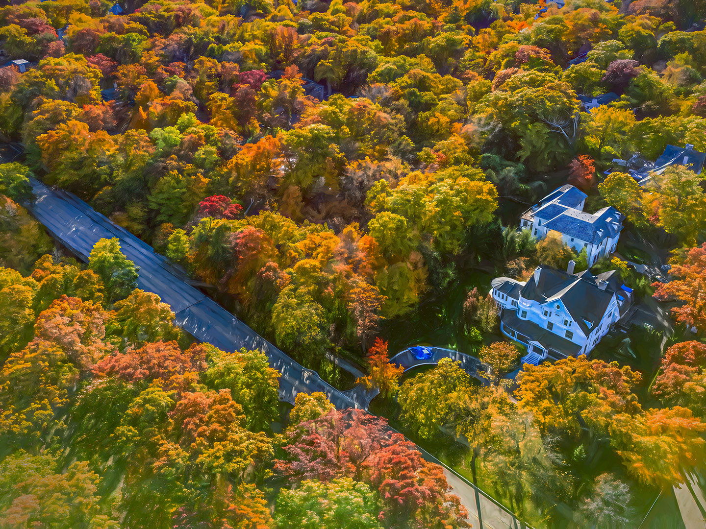 Since you wanted to capture Fall colors you did that quite well. At first look it is a canvas of bright color that is multiplied by the white home. The painterly effect sort of adds flow to the image or even motion. As an alternative, I would try to go a little darker on the image. I also use Topaz and almost always I reduce the effect ab out 50%.As an alternative I darkened the image in Photoshop and removed that on the house with the history brush. |