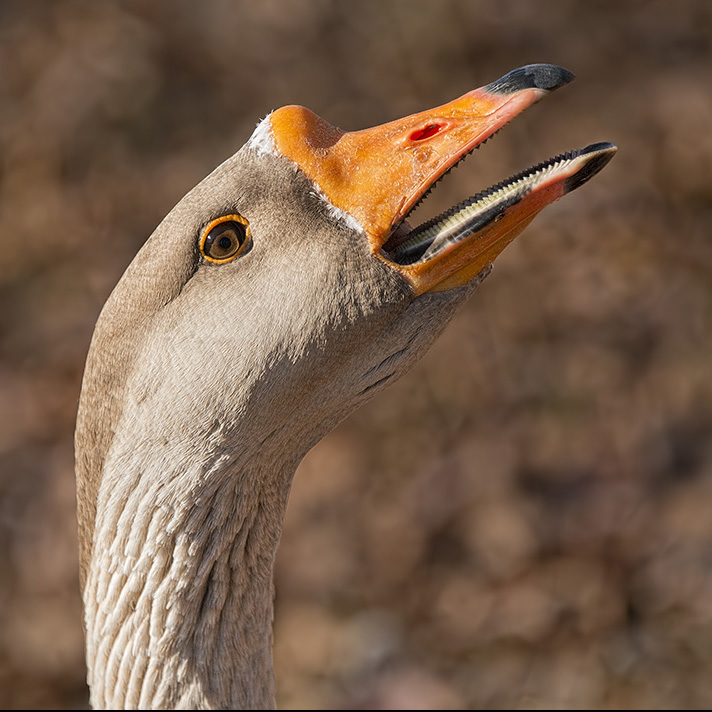 Beautiful, Wanda! The bird with its teeth, showing are very sharp. The angle is perfect. Well done! Re: the crop..I think portrait orientation works best, with a little more room on the left, to show the whole neck. |