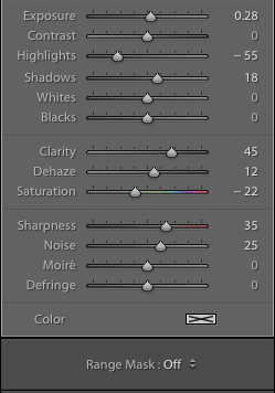 The Range Mask was one of the new bits added to LR a couple of versions ago. I finally found out how to use it. I selected the gradient mask, dragged the centre pin all the way to the bottom of the image. This changes the develop sliders on the right. Scroll down to the bottom of this bit and the Range Mask is there - not very user friendly looking. |