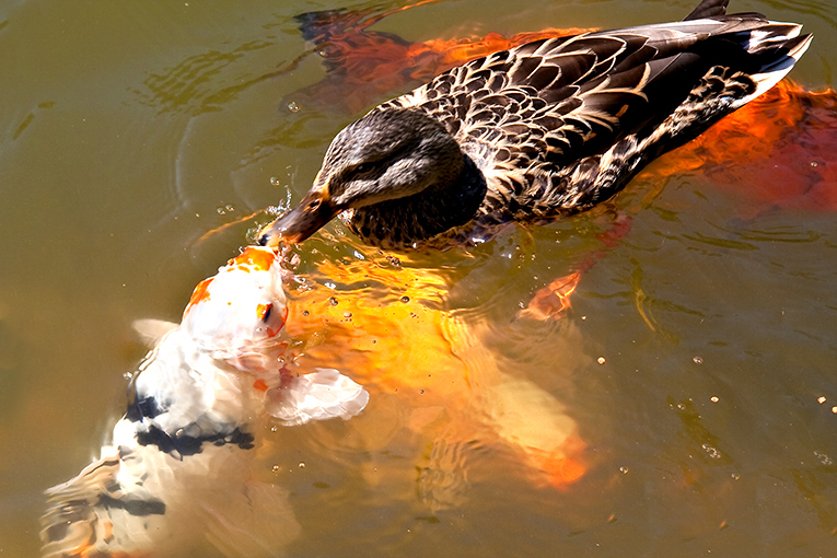 Since the story is about the food fight rather than all the other fish, I cropped in to bring focus to that and cloned out the fish on left. This brings more attention, then, to the water drops flying which helps tell the story. |