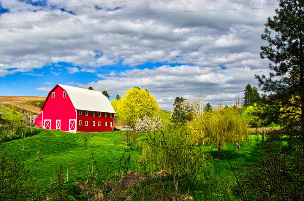 I like the red barn with the green grass. However, I thought it was a little small in the frame so I cropped in removing a lot of the stuff in the foreground which didn't add to the picture. Only other suggestion would be to clone out the wires through the clouds. |